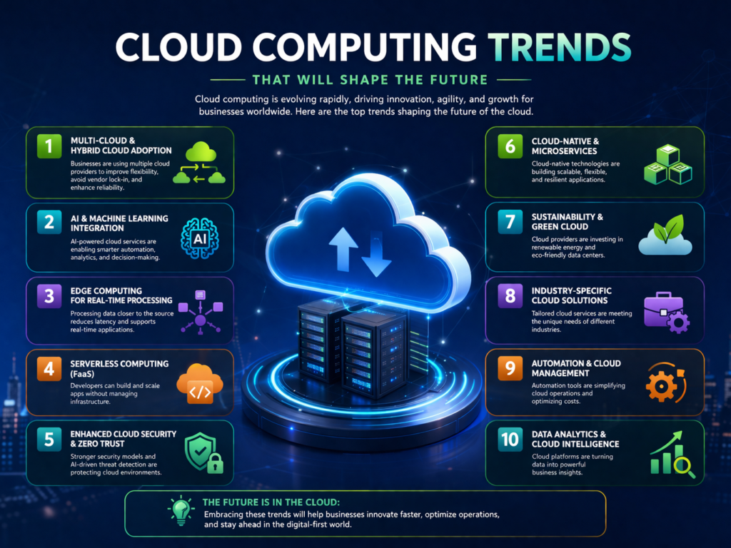 Cloud computing trends that will shape the future are transforming modern digital infrastructure, redefining how businesses store data, deploy applications, and scale operations. As organizations move deeper into a data-driven era, these cloud computing trends are evolving rapidly, enabling companies to innovate faster, improve efficiency, and stay competitive in a dynamic global market. From startups to large enterprises, cloud platforms have become essential for driving digital transformation and business growth.